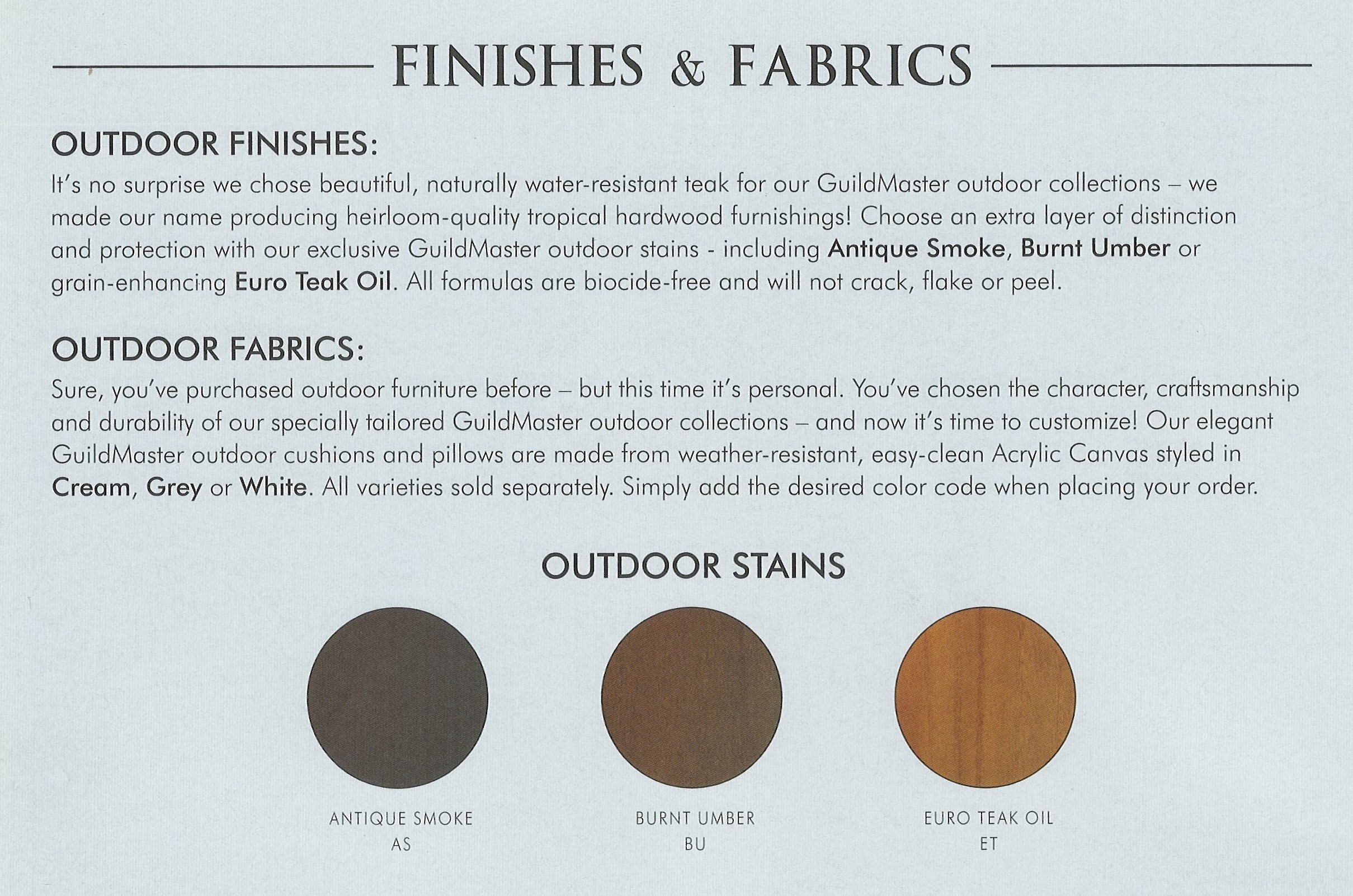 GuildMaster Premier Paint Finishes are the result of a meticulous multi-step process applied by talented master artisans. Rubbed edges, multiple layers, and antiqued surface details lend the appearance of generations-old heirloom furniture; while a specially formulated vintage color palette speaks to sophistication