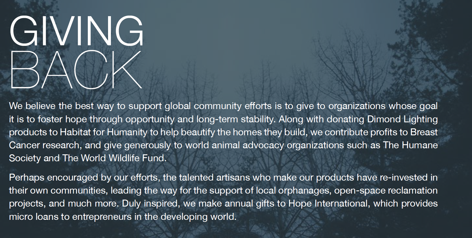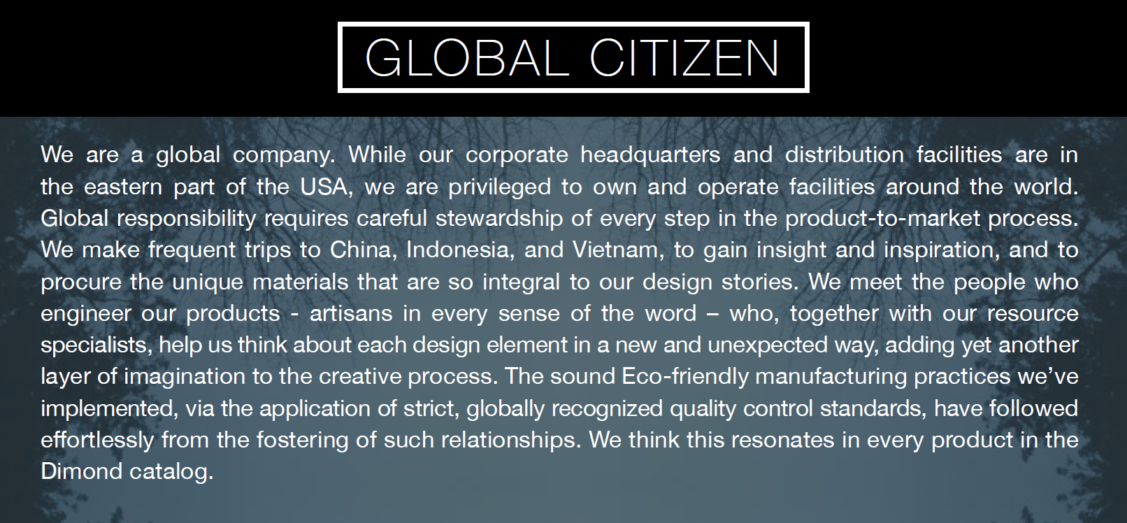 The people who love Dimond products have a passion for beautiful craftsmanship, bold design work, and sophisticated contrast. Our mission is to reinforce that notion by ensuring our products work for everyday life. Owning our own manufacturing and distribution centers allows us to carefully monitor our products for quality. Each finished piece is QC inspected for safety, construction, finish, and packing, and either conforms to or exceeds drop test standards. Our lighting conforms to UL, CUL and ETL standards for safety, and our outdoor items are salt-water tested to ensure they withstand the most rigorous natural conditions. Finally, every Dimond warehouse system supports optimized Green Processes, certifying our products measure up to global quality and responsibility standards.