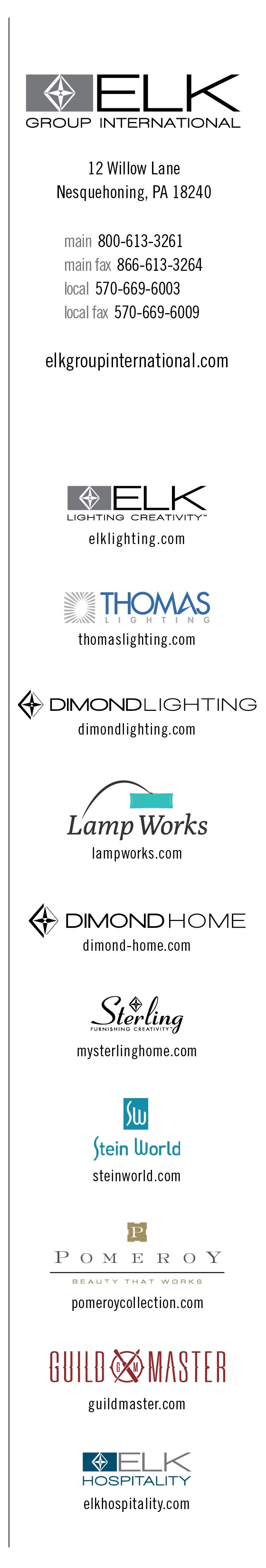 Long known for their innovative ELK and Dimond Lighting brand concepts, ELK Group has assembled a diverse portfolio of singularly successful home décor brands, including: Sterling, GuildMaster, Pomeroy, Stein World, RyvyR, and Old River Road, as well as builder-community legend Thomas Lighting.